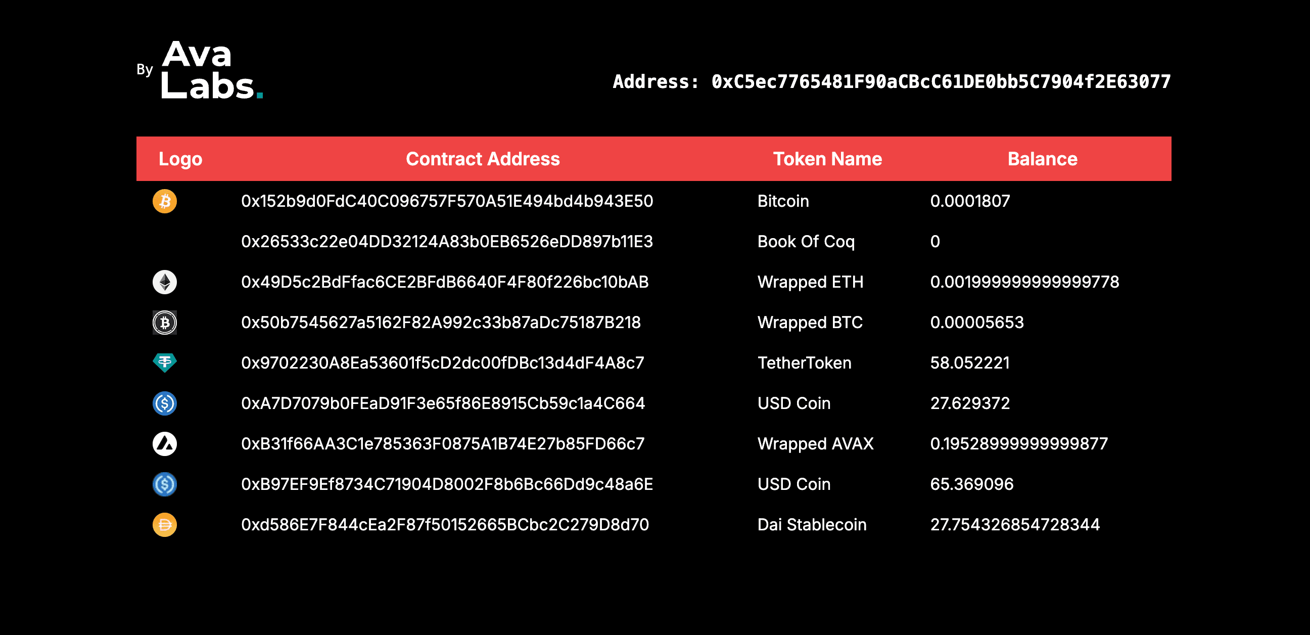 If we implemented the code correctly, we should have a working ERC-20 token balance app that displays the user's token balances. The app will look like the following: