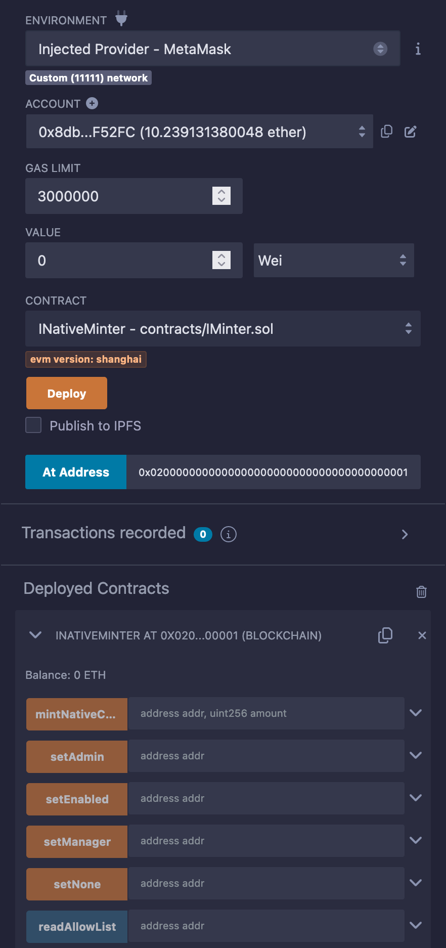 IFeeManager is our precompile, but it references the IAllowList, so we need that one as well. We compile IFeeManager.sol and use deployed contract at the precompile address 0x0200000000000000000000000000000000000003 used on the Avalanche L1.
