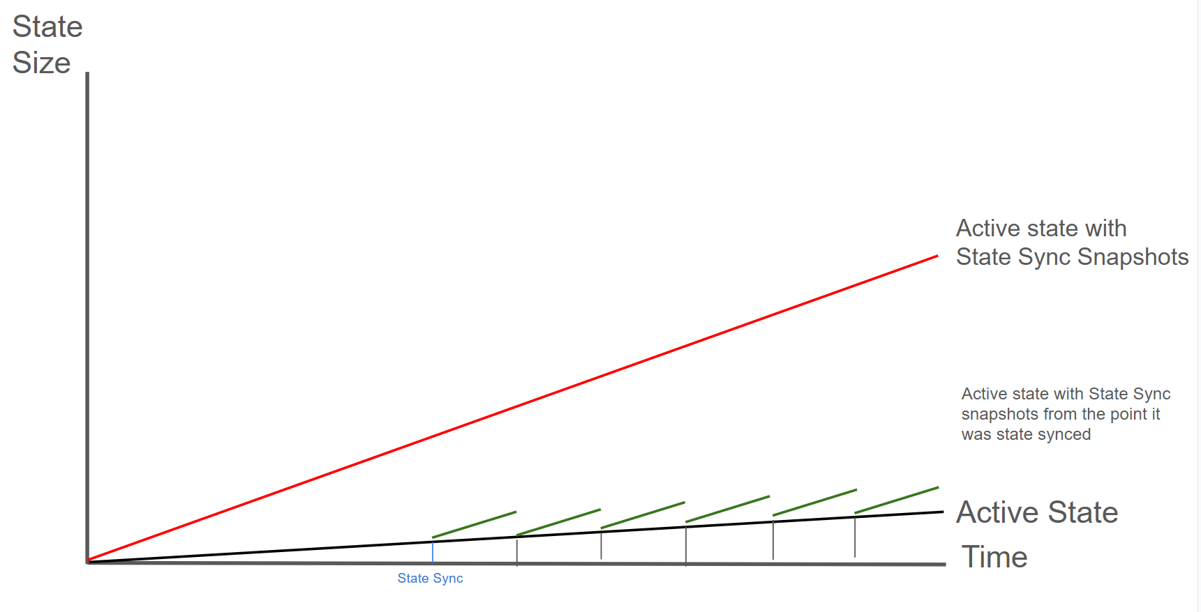 The green line shows a node performing periodic offline pruning. Each black vertical drop represents a pruning event: the node's state drops from "Active + Snapshots" back to just "Active State". Frequent pruning is recommended: it keeps disk usage low and each pruning operation completes faster since there are fewer snapshots to remove.